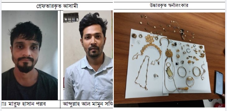 উত্তরা-পশ্চিম থানা পুলিশ অভিযান চালিয়ে নগদ টাকা ও কয়েক লাখ টাকার লুণ্ঠিত স্বর্ণালঙ্কার উদ্ধার করে। ঘটনায় সাথে জড়িত মোঃ মারুফ হাসান পল্লব (৩২) ও আব্দুল্লাহ আল মামুন সজিব (২৬)কে গ্রেফতার করা হয়েছে।