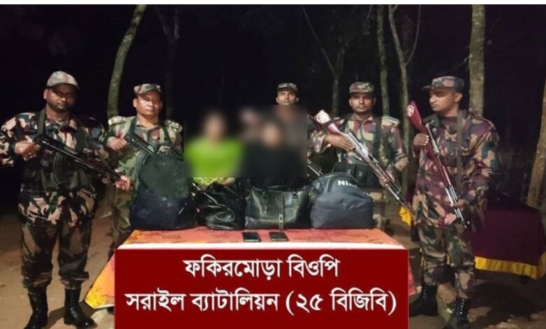 বৃহস্পতিবার দুপুরে ত্রিপুরার লঙ্কামুড়া সীমান্তপথে অবৈধভাবে ভারতীয় মানব পাচারকারী রাহুল দাসের মাধ্যমে পাঁচ হাজার টাকার বিনিময়ে বাংলাদেশি মানব পাচারকারী দালাল সাইমুনের সহযোগিতায় উপজেলার দক্ষিণ ইউনিয়নের আব্দুল্লাহপুর সীমান্তের ২০২২/৯-এস পিলার এলাকা দিয়ে বাংলাদেশে ফেরার সময় তাদের আটক করে ফকিরমুড়া বিজিবি ক্যাম্পের টহলরত জওয়ানরা।