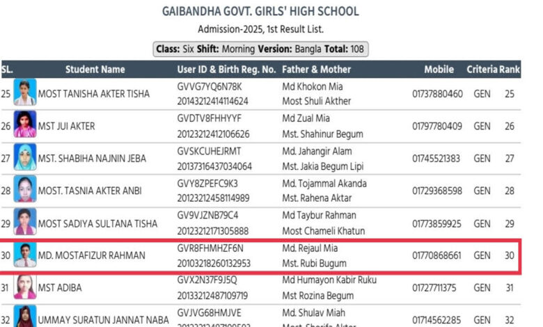 গাইবান্ধা সরকারি বালিকা উচ্চ বিদ্যালয়ের ২০২৫ সালের ভর্তির লটারির প্রথম ফলাফলের ওই তালিকায় দেখা যায়, প্রভাতি শাখার নির্বাচিত শিক্ষার্থীদের তালিকার ৩০তম স্থানে ‘মোস্তাফিজুর রহমান’ নামে এক বালকের নাম এসেছে। একই তালিকায় ওই বালকের বাবার নাম রেজাউল মিয়া ও মায়ের নাম রুবি বেগম উল্লেখ করা।