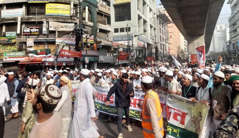 শুক্রবার (১০ জানুয়ারি) জুম্মার নামাজ শেষে জাতীয় মসজিদ বায়তুল মোকাররমের উত্তর গেটে ওলামা মাশায়েখ বাংলাদেশ ও তৌহিদী জনতার উদ্যোগে বিক্ষোভ সমাবেশে এই দাবি জানানো হয়।